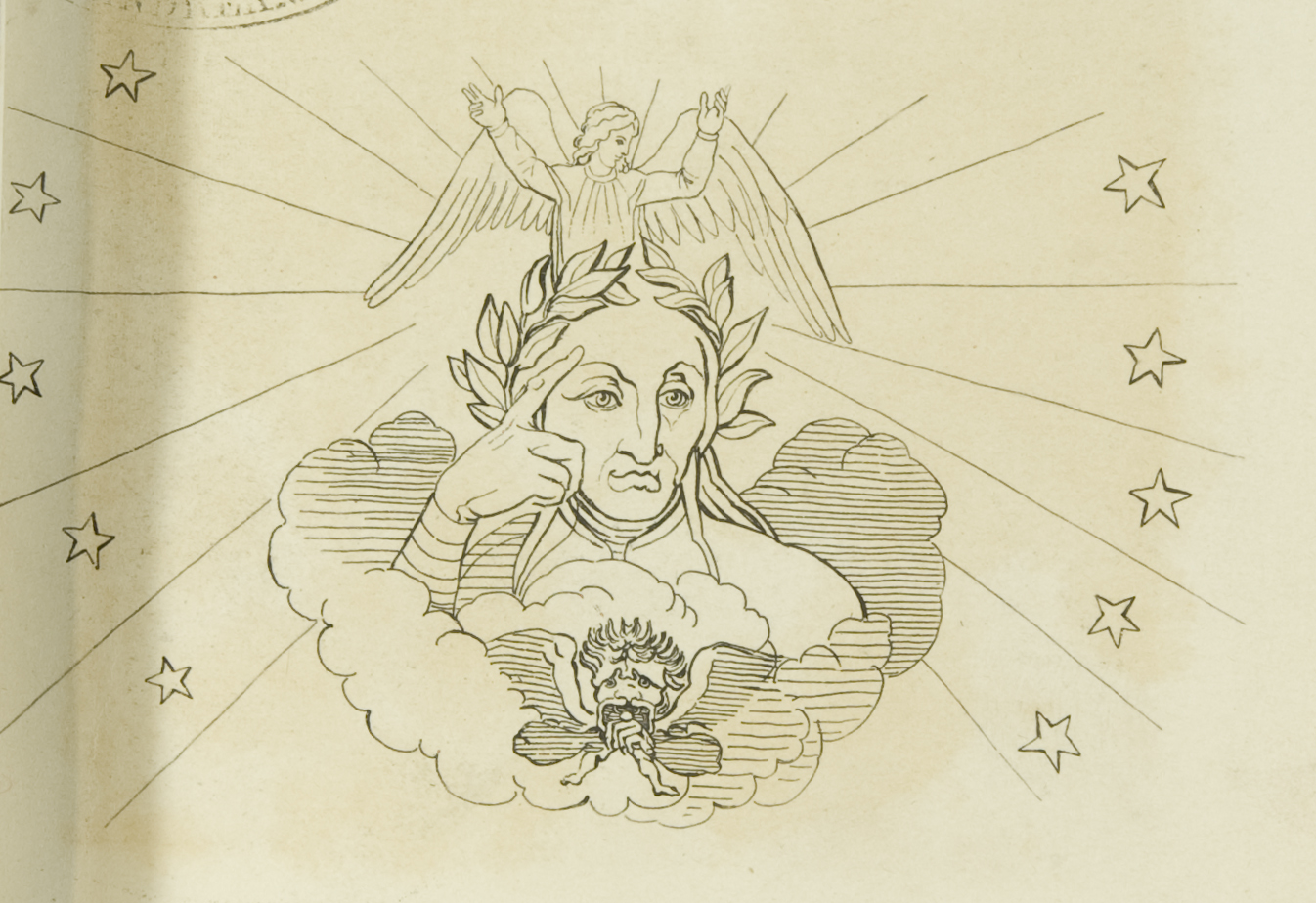 Diese beiden kleinformatigen Dante-Ausgaben des 19. Jahrhunderts enthalten einige interessante Aufnahmen von Standard- Commedia-Illustrationen. Oben sind die drei Diagramme von Inferno, Purgatorio und Paradiso aus dem Druck von Pietro Fraticelli von 1889 zu sehen . Diese Illustrationen, mit dem hier abgebildeten Porträt, sind die einzigen, die in dieser Ausgabe zu finden sind, aber das Porträt hat eine andere Qualität als die, die am häufigsten von Dante gefunden wurde (siehe unten Doré oder die von Flaxman inspirierte Gravur auf der Recht). Unten und rechts sind zwei Illustrationen, die in IC Wrights englischer Übersetzung der Commedia von 1866 gefunden wurden. Diese Ausgabe wird mit „Stiche auf Stahl, nach Entwürfen von Flaxman“ illustriert, was John Flaxman bedeutet, ein neoklassischer Bildhauer und Künstler.